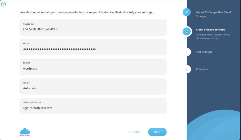 Enter the details Access Key, Secret, Bucket Name, Region and Custom Endpoint. You will get these details from Vultr dashboard. Here is what it should look like. Once you fill the required details, click Next.