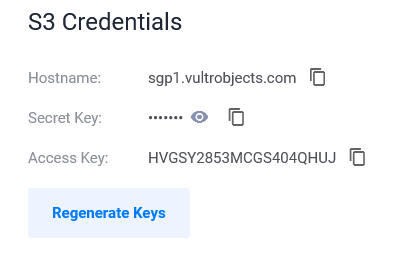 You will get to see the S3 Credentials. Kindly note them and keep them safe. Make sure none other than you has access to it. Even if you forget OR delete them, you can log in to Vultr and retrieve them.