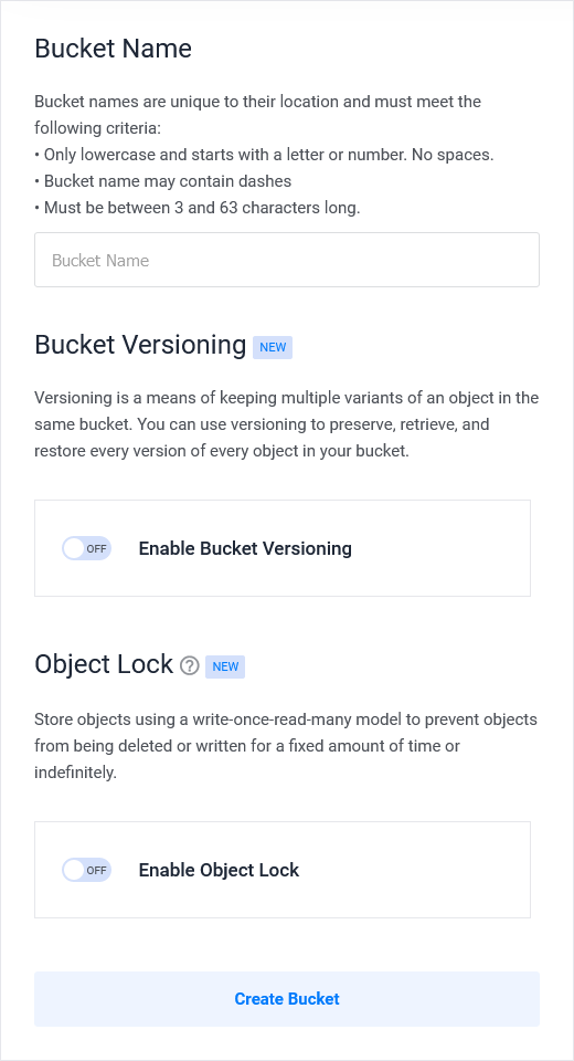 Click on the Create Bucket button as in the image above. Give a Bucket Name that is easy for you to recognize. It can be your project name OR website name. You can Enable the options Bucket Versioning & Object Lock by clicking on the toggle button.